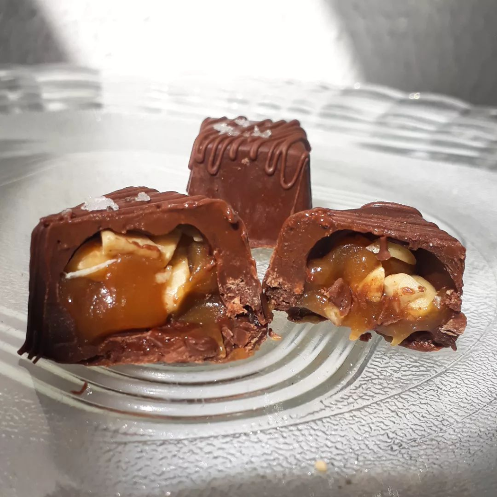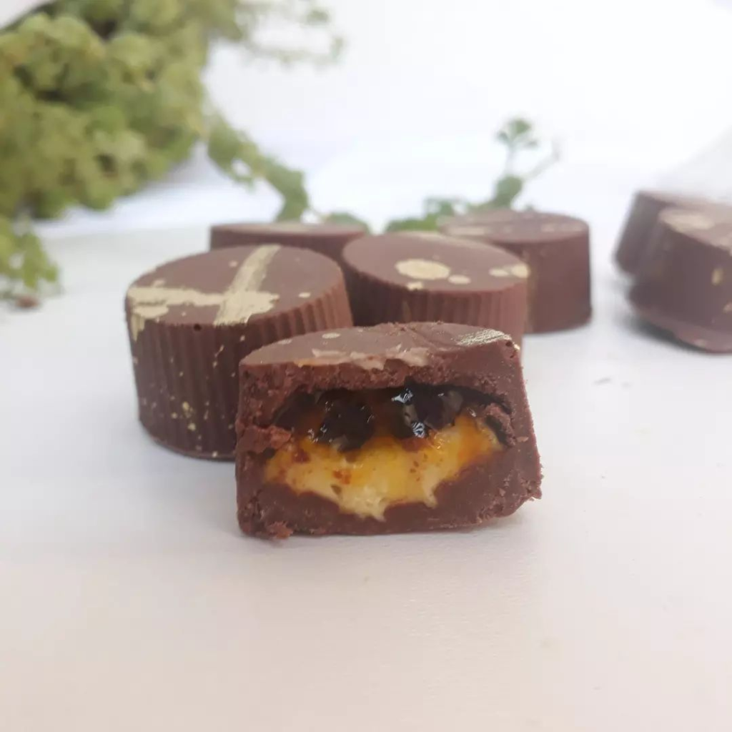 Casquinha de chocolate nobre ao leite, e recheio azedinho de maracujá com calda.