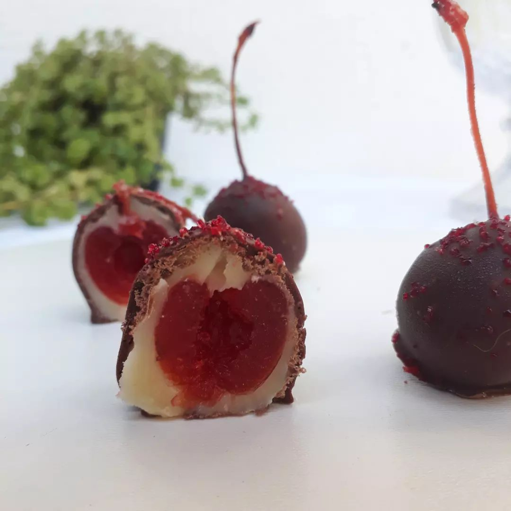 Cereja em calda inteira, envolvida em brigadeiro gourmet branco, banhado em chocolate meio amargo nobre.